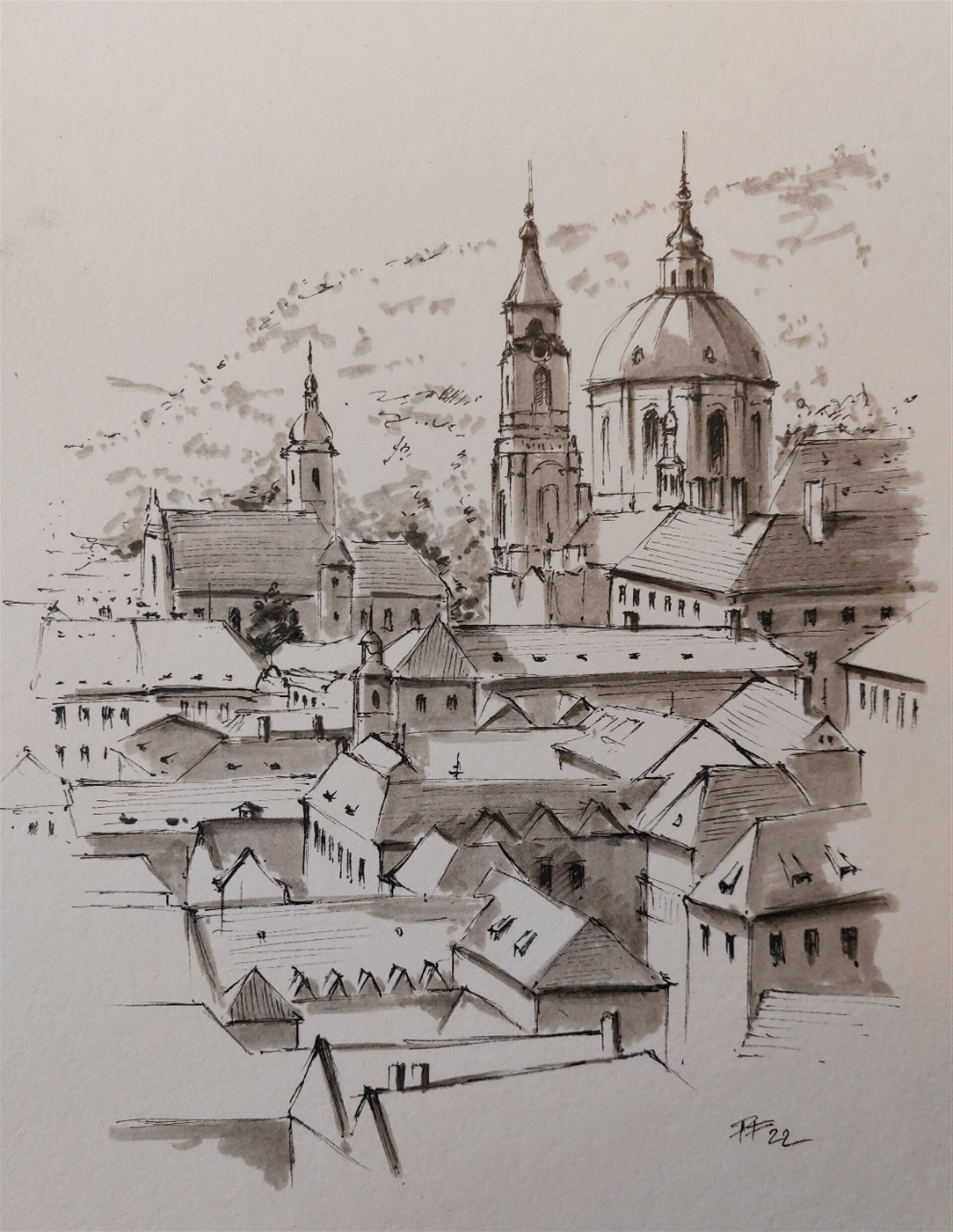 kresba "Malá strana se svatým Mikulášem (ze zahrady Na valech)", kresba perem, marker papír