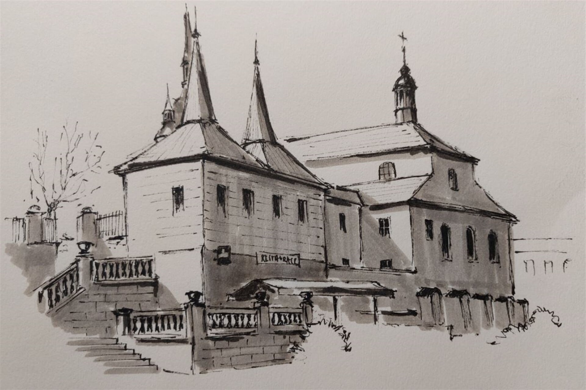 kresba "Restaurace Věžičky, Teplice", kresba perem, marker papír