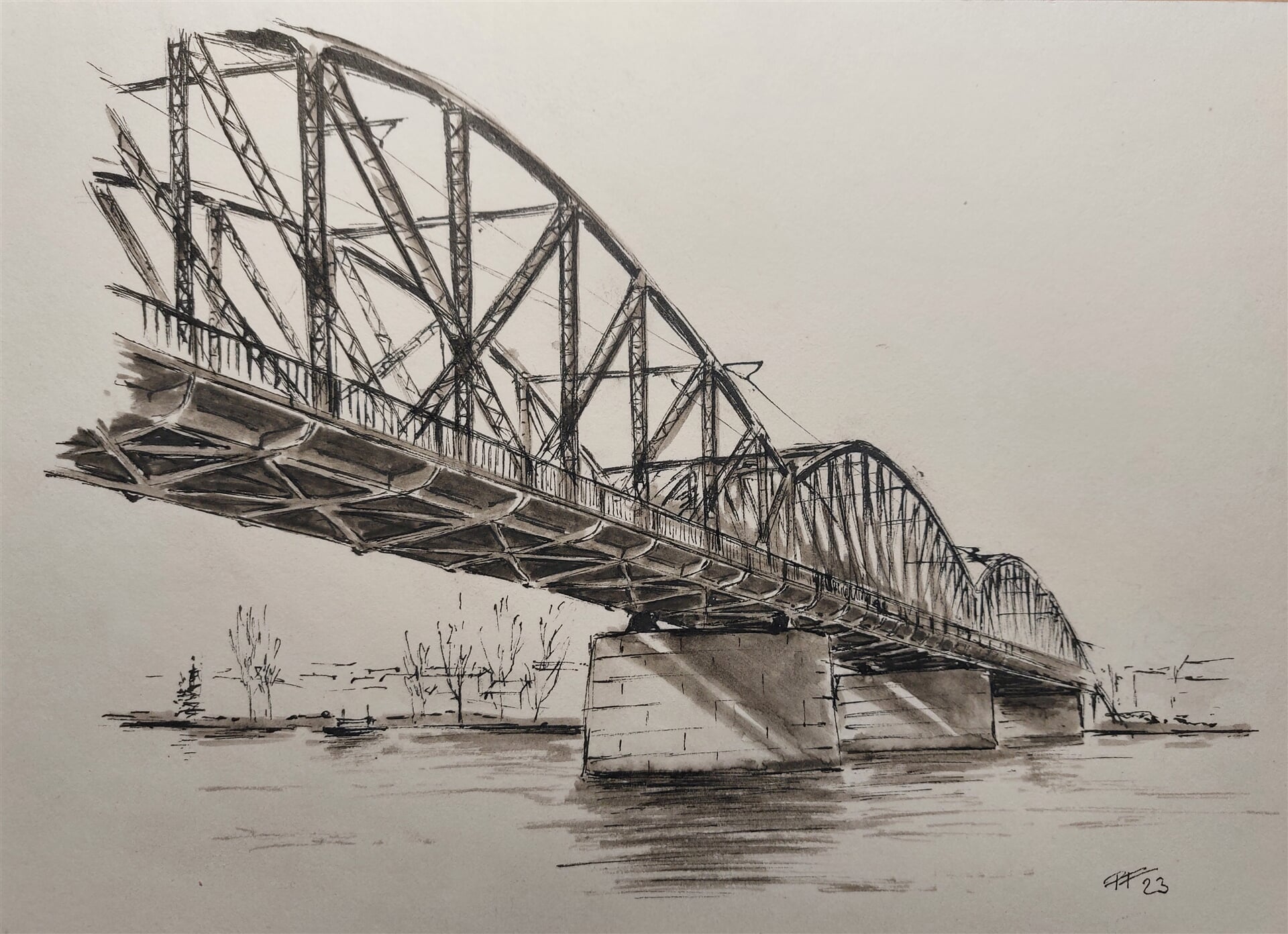 kresba "Železniční most na Výtoni, Praha", kresba perem, marker akvarelový papír